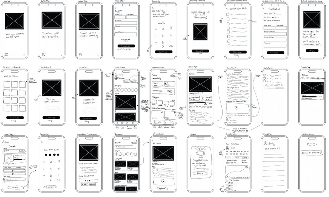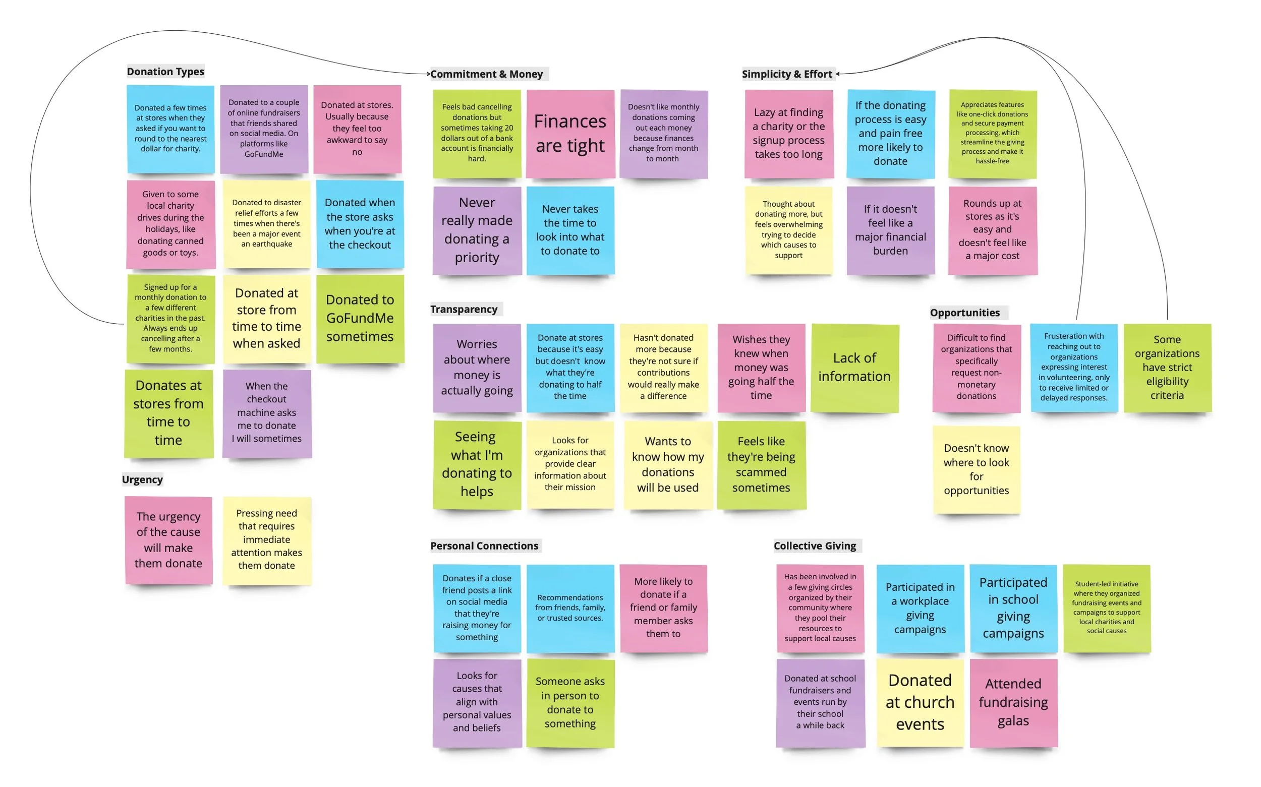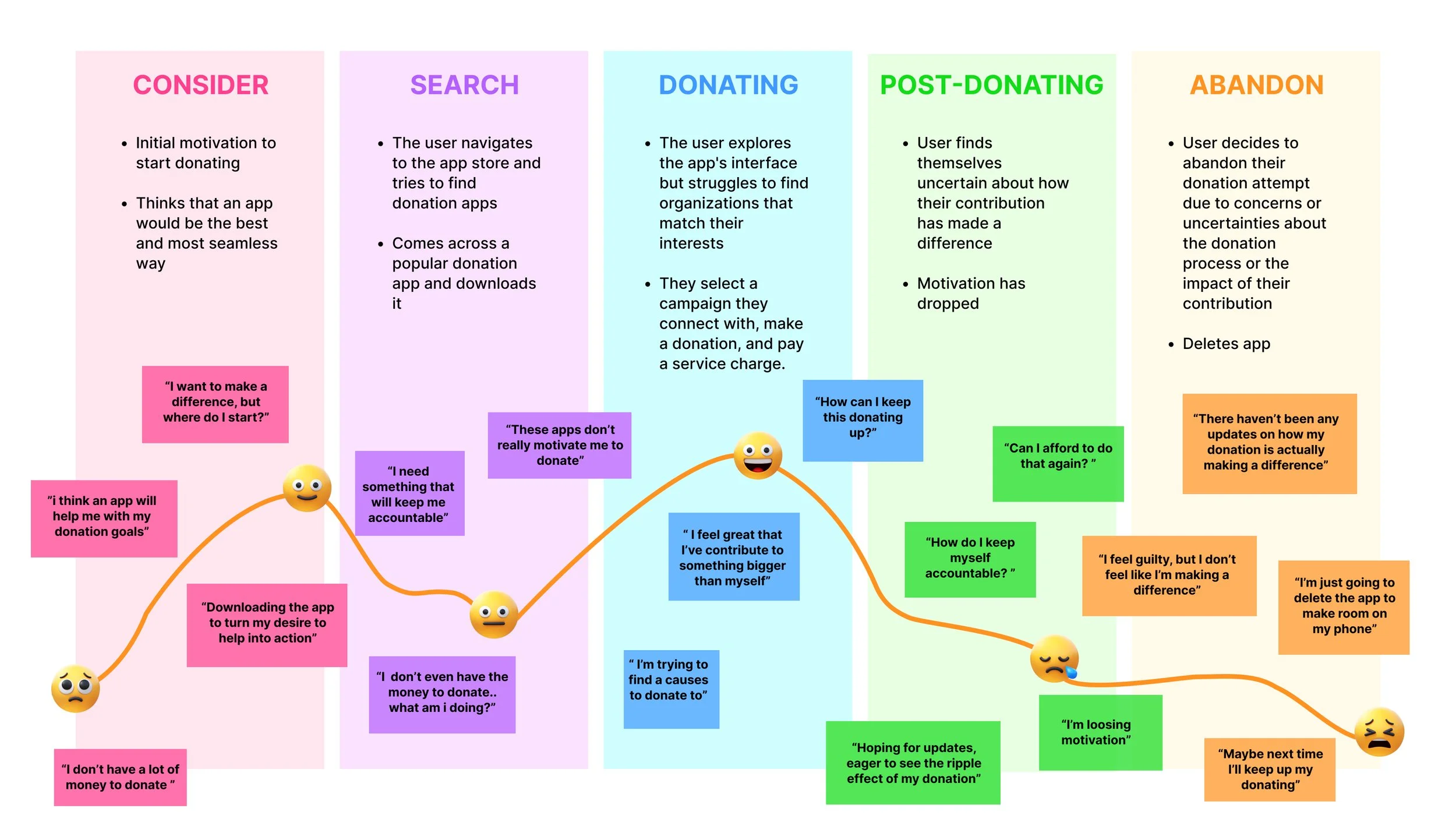 I mapped the current user journey of donating on an existing donation platform from the data collected. From here, I identified stages that could be improved to make donating more accessible and engaging and enable people to find and support their favourite charities.