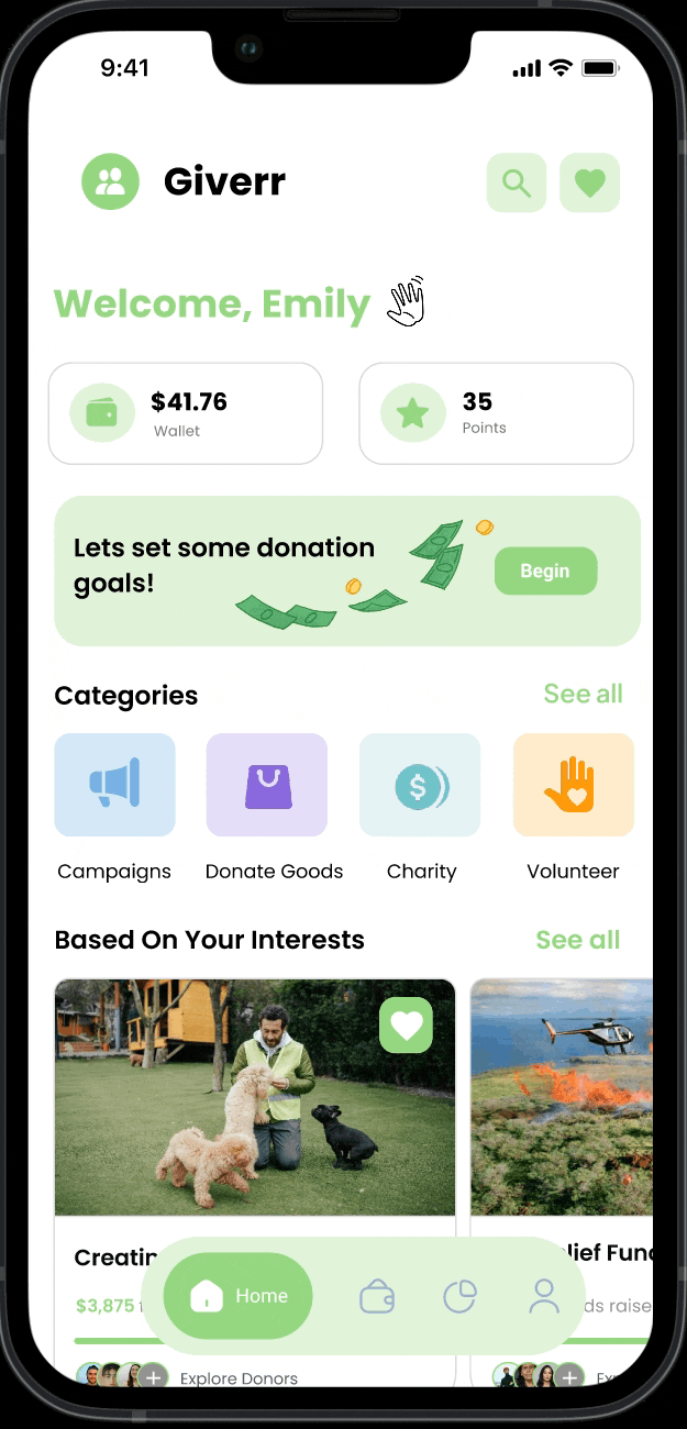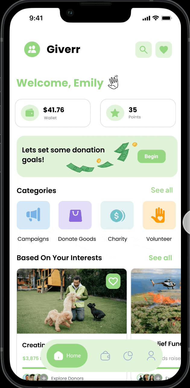 A clear call-to-action for donations was added to guide users quickly to their desired charity, along with a horizontal scroll feature for seamless exploration of more charities within their interests.