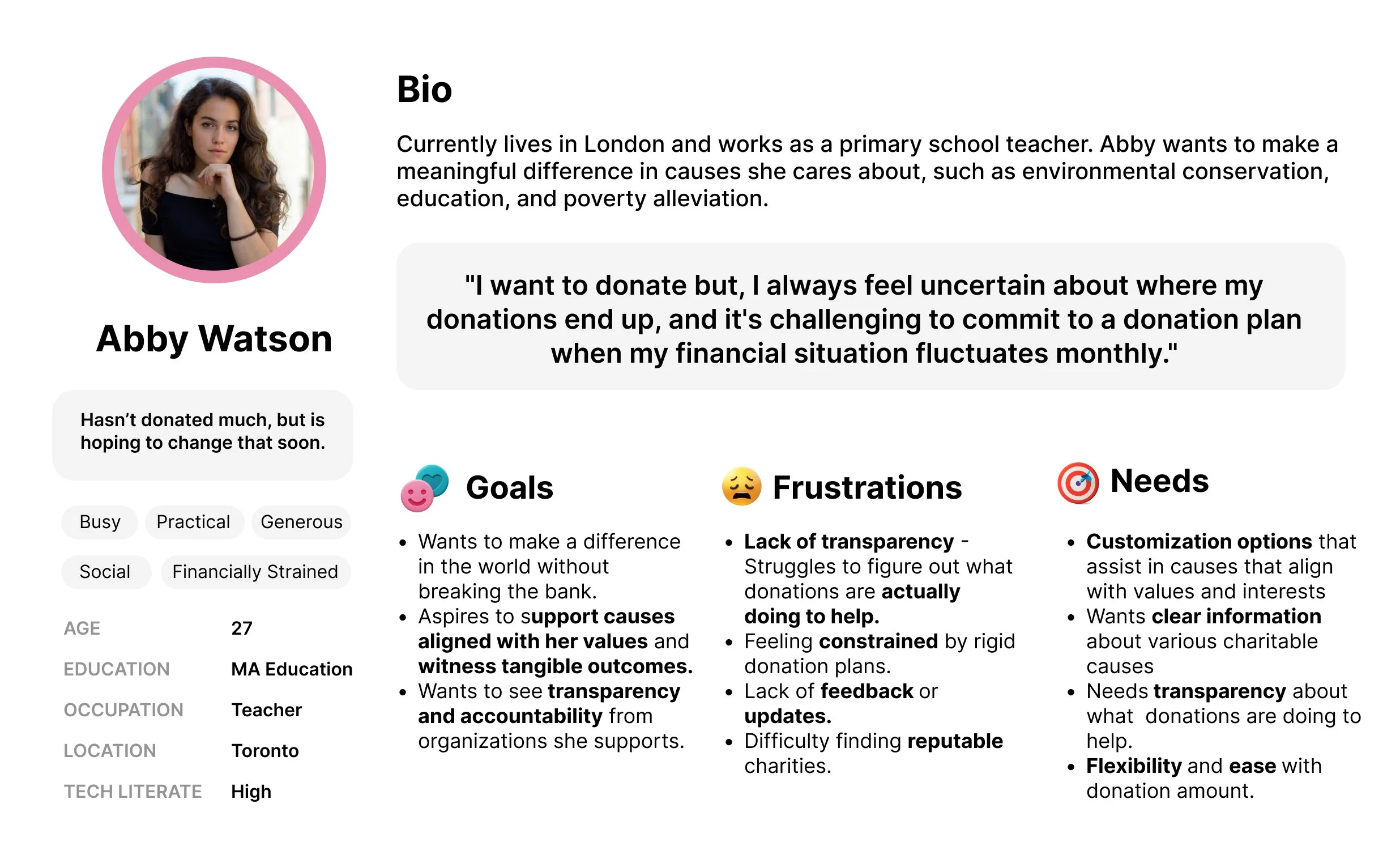 A user persona was created to better understand the needs, behaviours, and motivations of the target audience, helping to guide the design and optimisation of the donation platform.